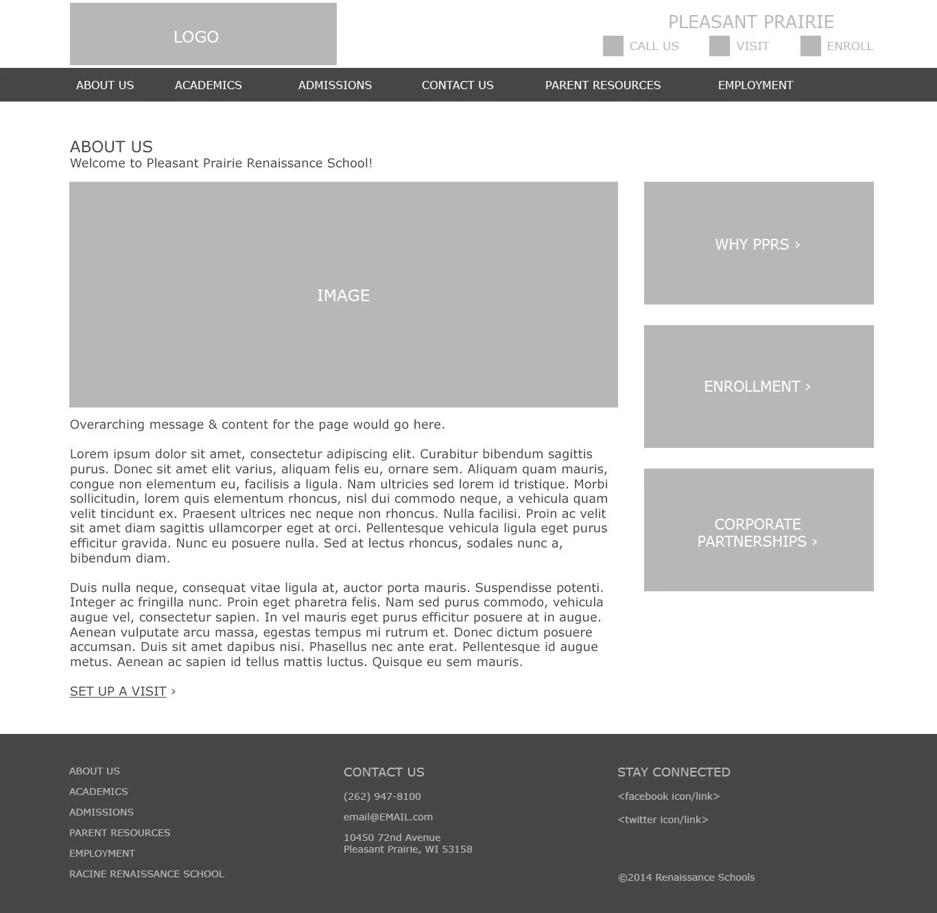 Next, I wire framed the home page and an example interior page to ensure we were aligned on content, layout and user flow. I also showed how these would resize on a mobile-friendly screen.